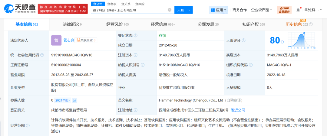 锤子科技(成都)股份有限公司成立于2012年5月,法定代表人为管志良,注册资本约3149.8万人民币,经营范围含基础软件服务、应用软件服务、组织文化艺术交流活动、承办展览展示活动等。主要人员信息显示,罗永浩在该公司担任董事长并持股约23%。
