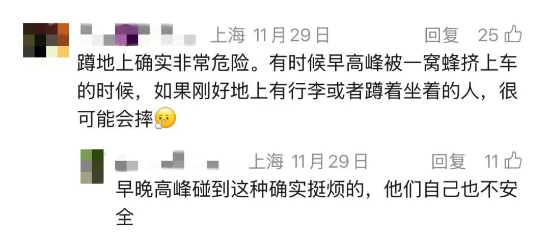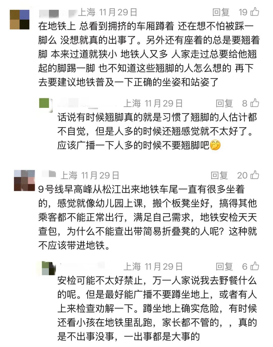 这些蹲坐族在11号线和9号线等长线中由来已久,他们大多单程通勤时间在1小时以上,自带"装备"在车厢角落"安营扎寨",与正常站立的乘客发生摩擦也是常有的事。