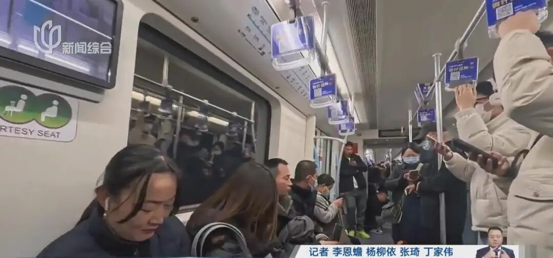 在同一时间的11号线上,开往市区方向的列车也是趟趟满载,在头尾车厢内,几乎每趟车都能看到蹲坐着的乘客。