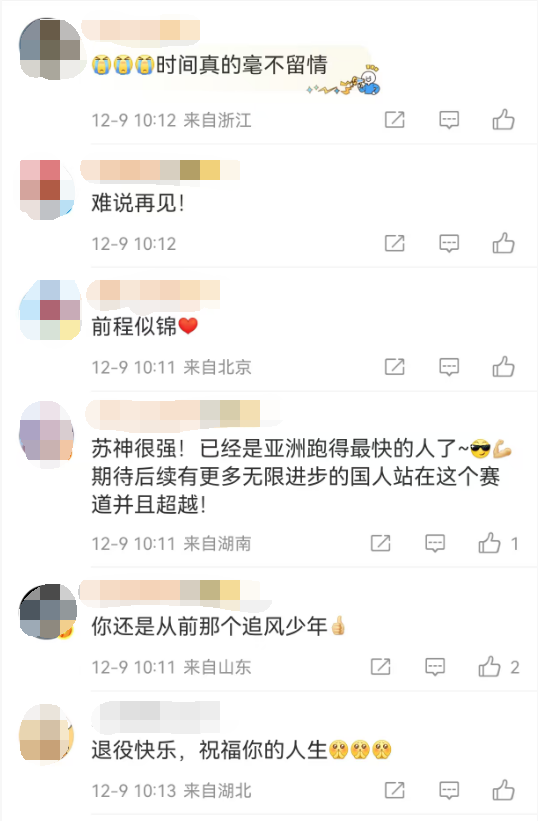 : 12月9日,男子100米亚洲纪录保持者、中国短跑名将苏炳添宣布退役。苏炳添微博发文,告别二十一载跑道时光。网友:退役快乐,前程似锦来源:新民晚报、如有侵权请联系删除 ... ... ...