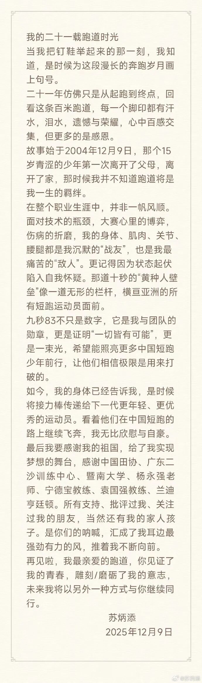 苏炳添微博发文,告别二十一载跑道时光。