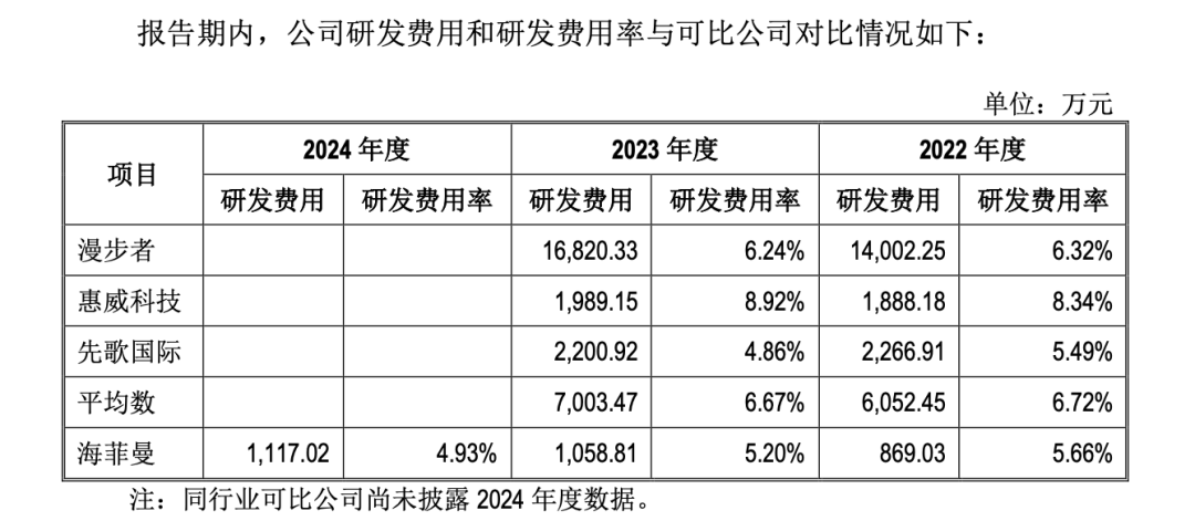 但相比之下,公司研发费用率在2022-2024年分别为5.66%、5.20%和4.93%,呈现逐年微减趋势。公司方面坦言,从研发费用绝对金额来看,其研发费用低于可比公司(6%-8%)。