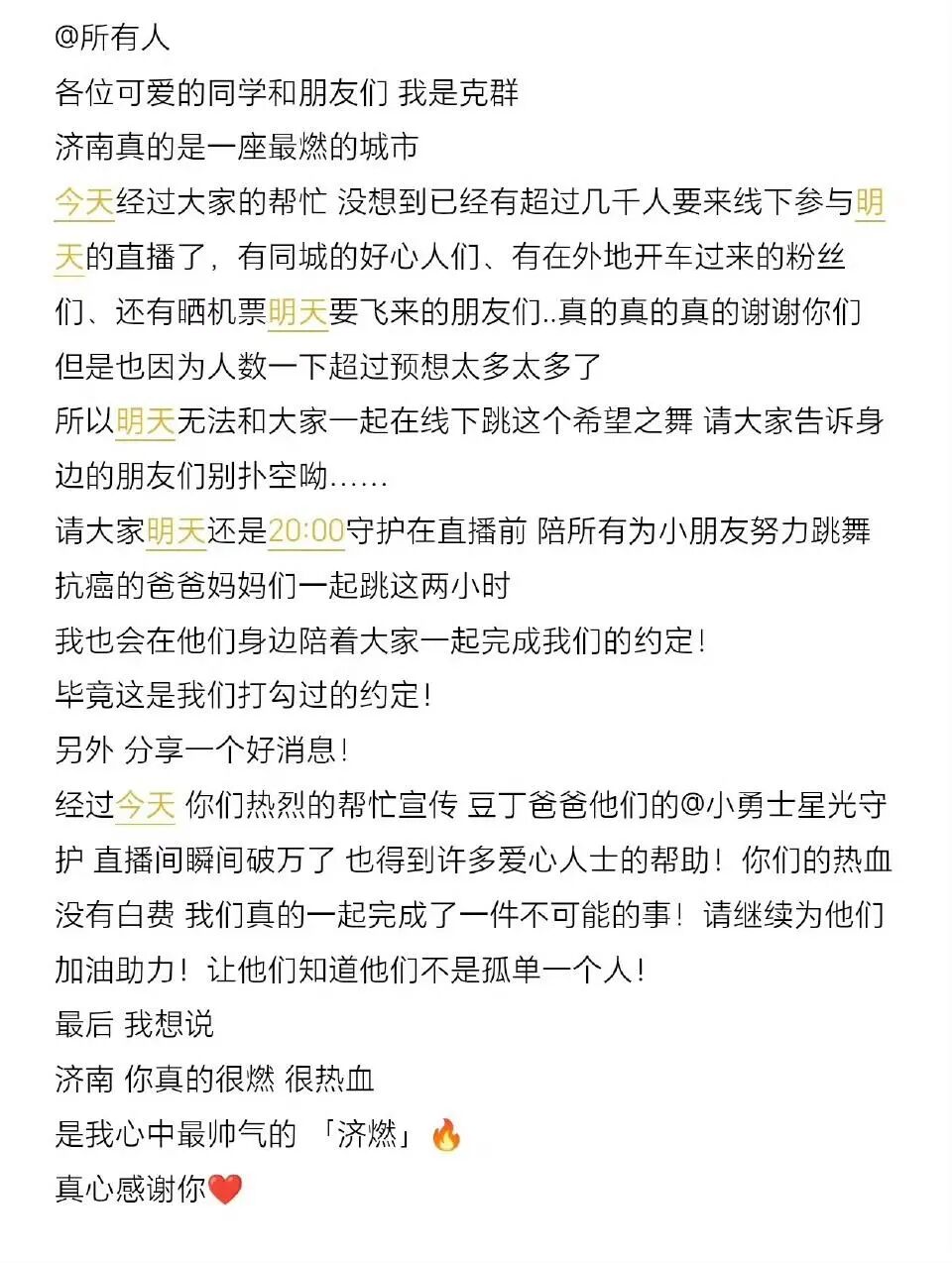 之后,吴克群工作室发文称,经过大家的帮忙,已经有超过几千人要来线下参与明天的直播了,有同城的好心人们,有在外地开车过来的粉丝们,还有晒机票明天要飞来的朋友们……真的谢谢你们,但是也因为人数一下超过预想太多了,所以明天无法和大家一起在线下跳这个“希望之舞”,请大家告诉身边的朋友们别扑空,也请大家明天还是20:00守护在直播前,陪所有为小朋友努力跳舞抗癌的爸爸妈妈们一起跳这两小时,我也会在他们身边,陪着大家一起完成我们的约定!毕竟这是我们打勾过的约定。