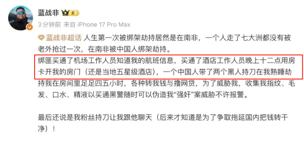 但这一次,他真的就差点死在了远方。根据他自爆,在南非遭遇当地中国人绑架,财产被洗劫一空。
