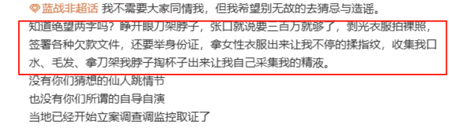 在被劫持的四五个小时内,绑匪让他脱光衣服拍裸照,在女性衣服上揉指纹,收集他的指纹、毛发、口水甚至精液,并威胁他如果报警就伪造他“强奸”。这不是普通威胁,而是利用司法系统反制受害人。