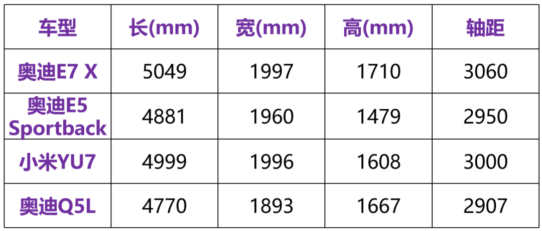 从图片来看,奥迪E7 X的体量似乎不算大,但它却是一台标准的“532”级中大型SUV,比奥迪自家的Q5L大了一圈,轴距较E5 Sportback长了110mm,和同样定位运动型SUV的小米YU7相比,奥迪E7 X各维度的尺寸也都要更大。