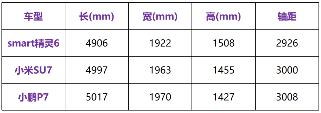 轴距超过2米9、车长超过4米9,smart精灵6号已经跨过了C级中大型轿车的门槛,但是它并没有达到所谓的“532”标准,整体的长度和车宽,都明显比同为C级轿车的小米SU7、小鹏P7要小半圈。