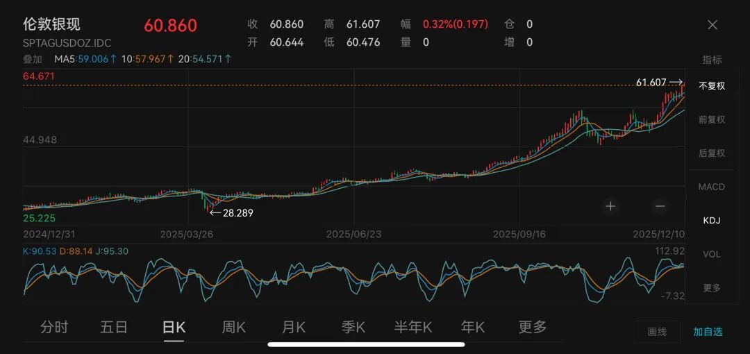 12月10日,白银现货价格攀上60美元/盎司,创历史新高。