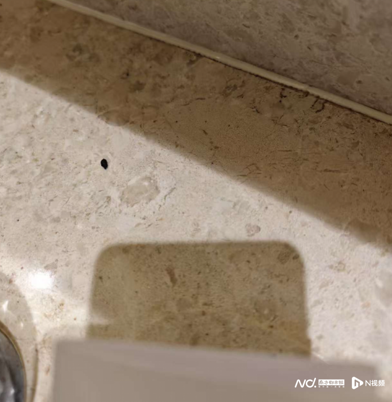 吴女士表示,开灯后,她在洗手台、毛巾及水池内均发现了老鼠排泄物。其提供的相关图片显示,在浴巾上疑似有淡黄色的液体残留,在洗手台等地也有几粒疑似老鼠屎的东西。