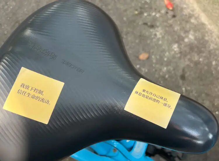 他把自己创作的与骑车相关的小句子打印在不干胶贴纸上,遮住车身黄色小广告。“骑单车时会无意瞥见很多黄色小广告,单车是无辜的,我的眼睛也是无辜的,希望骑单车时,可以多一点温暖,少一点污染。”