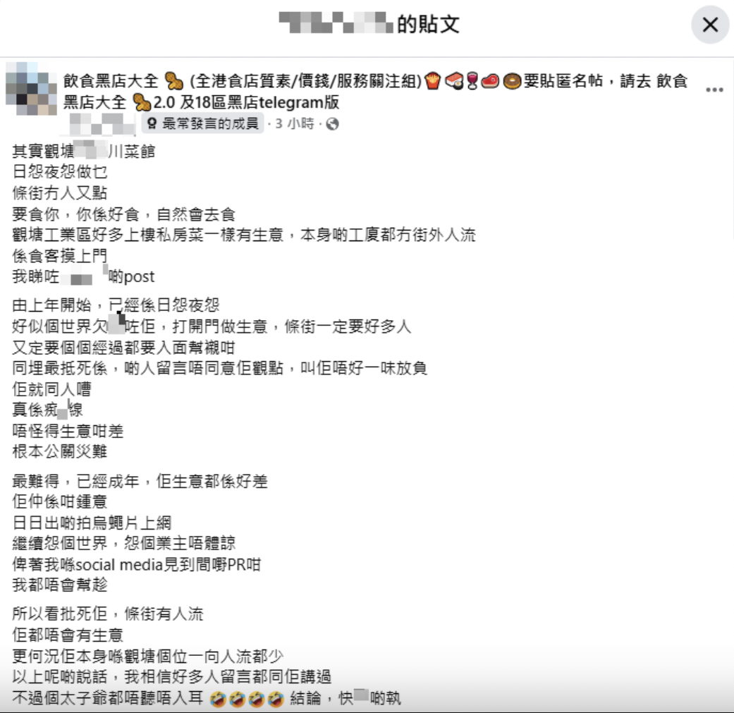 可是你说老板每天发文发到像在“责怪世界没来吃饭”,对顾客、对街坊、对路人来说,真的很难不反感。