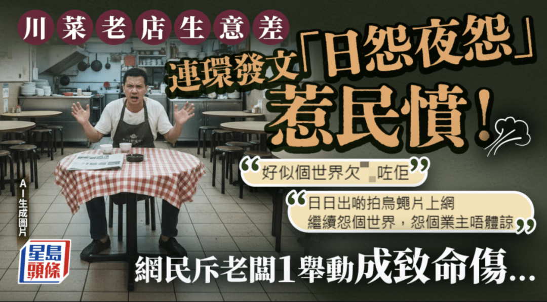 事情是这样开始的 —— 有网民在社交平台贴出截图,表示自己已经观察这间川菜馆很久了,发现老板几乎天天都在网上发“生意差”“条街冇人”“区内没人支持”等负面帖文,而且数量多到有点夸张。