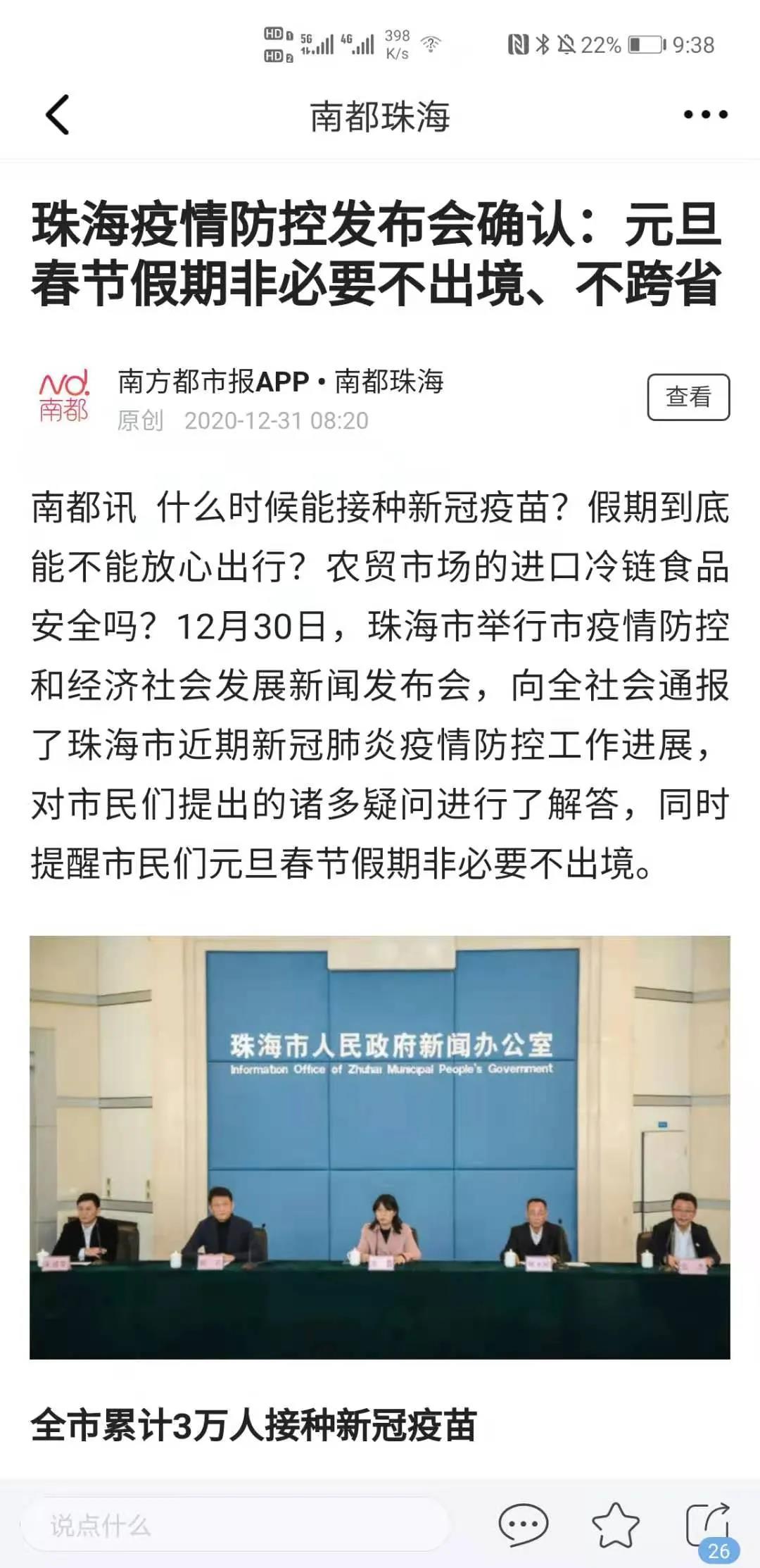 疫情防控千万不能大意! 就在刚刚 珠海发布最新通告 停办2021年珠海市 迎春花市 关于停办2021年珠海市 迎春花市的通告 根据当前疫情防控的形势及工作措施要求,经研究,决定停办2021年珠海市迎春花市,市民可通过市场网点、网络渠道购买年花。倡议广大花卉种植户通过市场及网络销售、送货上门等方式,为市民群众提供应节时花。 特此通告。 珠海正方商业运营管理有限公司 2021年1月4日 早些时候 珠海召开疫情防控发布会 确认春节期间 非必要不出境、不跨省