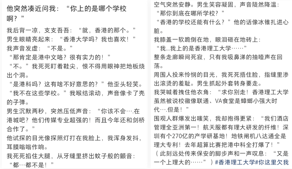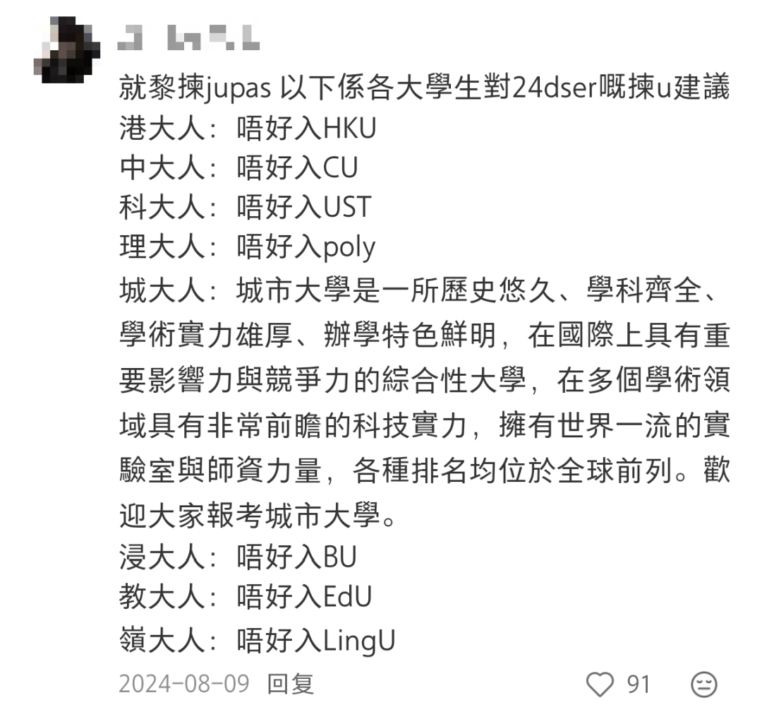 接着把所有的学校都说一遍,最后才透露自己的学校,像这位网友,TA就是香港理工大学的: