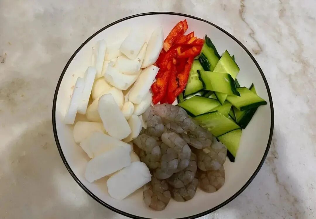 放入荸荠、青瓜、红椒丝焯水2分钟捞出沥干水分