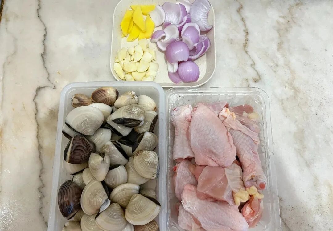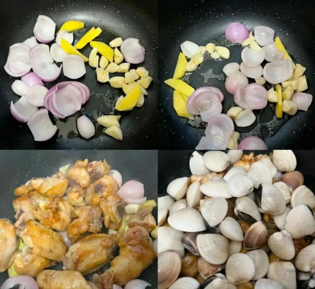 在广东每逢佳节宴客、平日聚餐 都少不了一盘鸡 正所谓“无鸡不成宴” 除了白切鸡、豉油鸡等经典名菜 鸡煲的做法也是多种多样 今天分享一道白贝鲜鸡煲 鸡肉香、白贝鲜 不加一滴水鲜味十足、香甜可口 鸡肉吸收了白贝的甜,鲜甜嫩滑 吃过都说赞 食材:鸡肉、白贝、姜、洋葱、蒜 调料:花生油、盐、生抽、胡椒粉、淀粉、米酒 鸡肉洗净沥干水分 加1小勺盐、少许胡椒粉、1勺生抽、1勺淀粉抓拌均匀 最后加油锁味腌制20分钟 热锅热油放入鸡肉 煎至两面金黄盛出备用 锅内留油放入姜片、蒜瓣、洋葱炒香 再放入鸡肉铺平 上层放入白贝 淋上一圈米酒 盖上盖子焖8分钟就完成啦 一开盖香气扑鼻 白贝鲜甜、鸡肉嫩滑 真的是绝佳的搭配 来源:千厨百味、如有侵权请联系删除