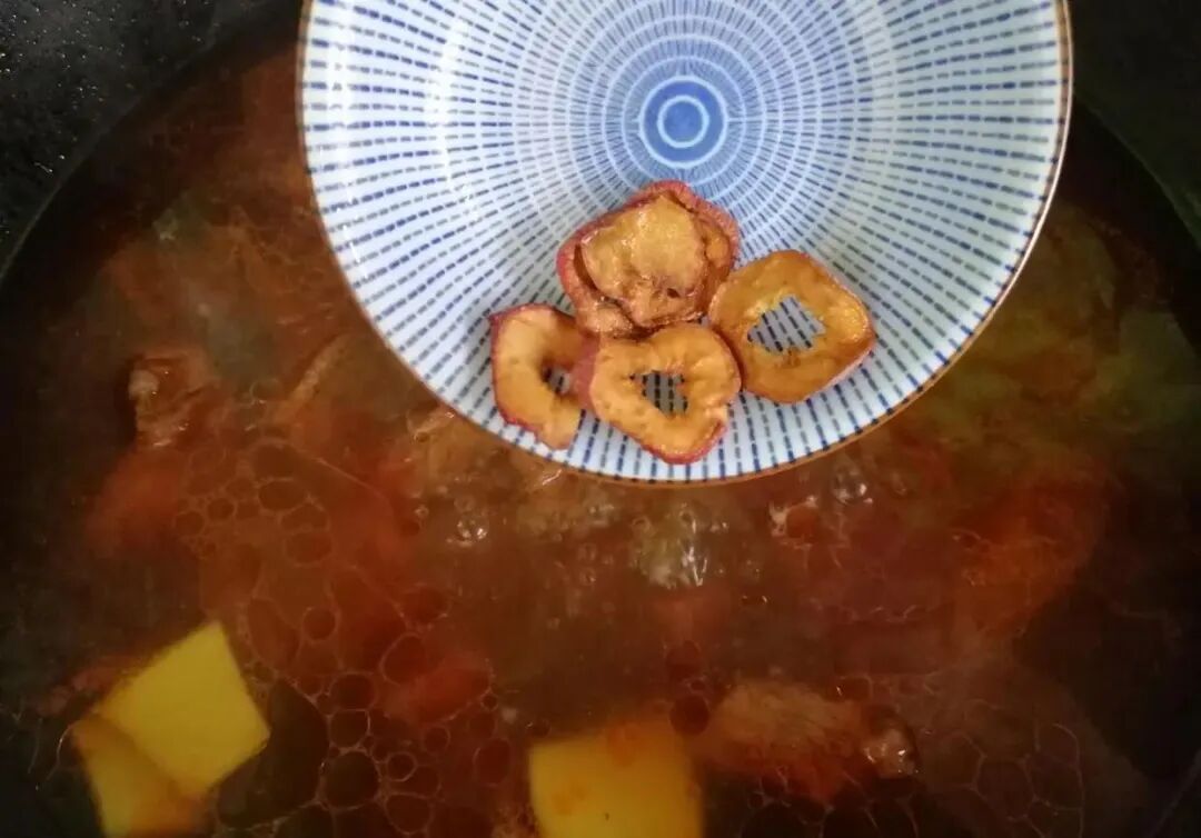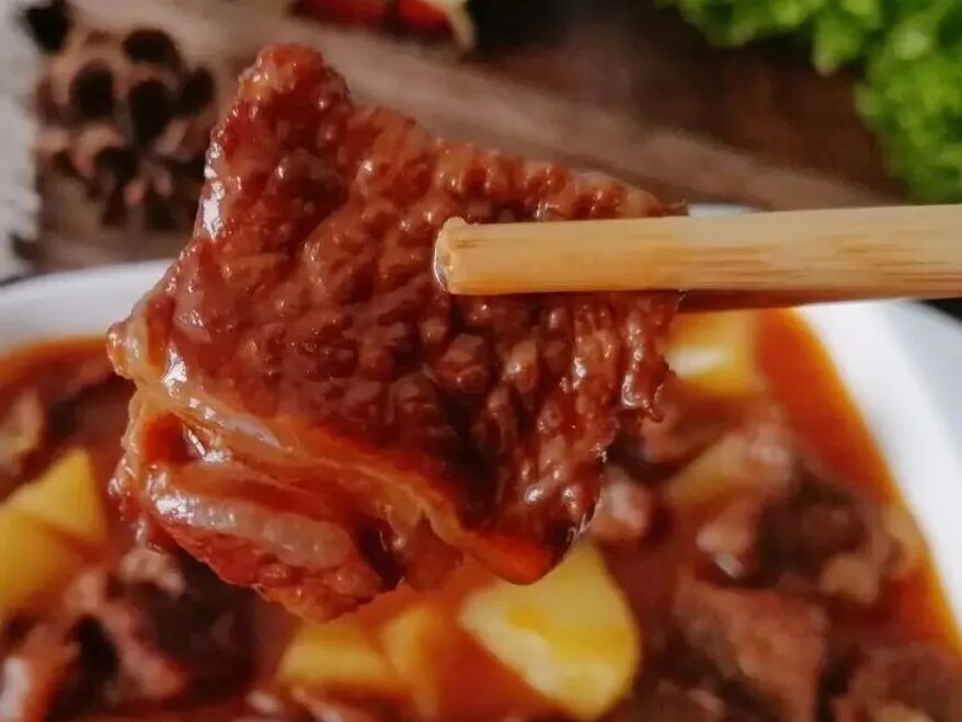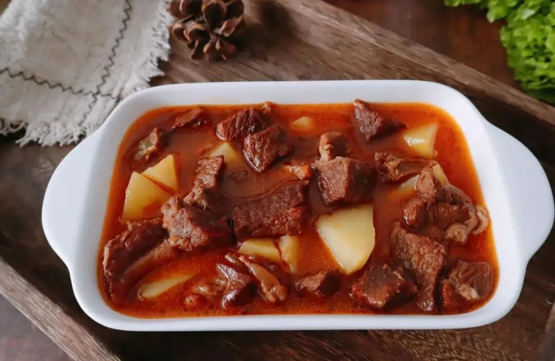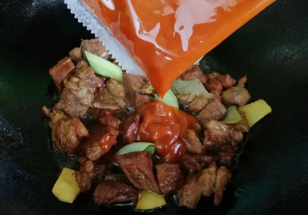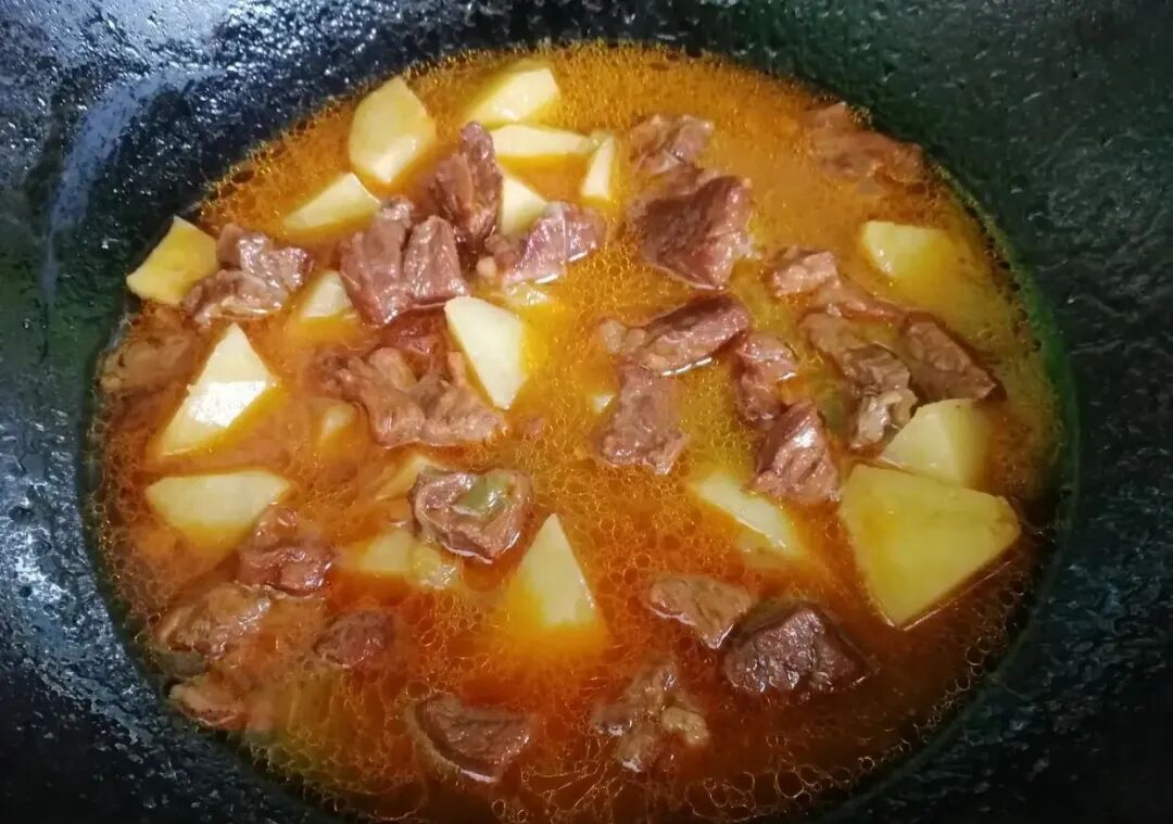 今天做了一道牛肉炖土豆,是用的铁锅来炖的,加了几片山楂干,半个多小时就炖好了,吃一口肉香汤汁饱满,超好吃,放了酱料,汤汁也酸酸甜甜的很好喝,用它来拌米饭或者面条,味道绝了!