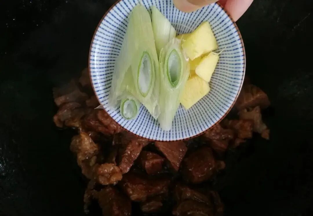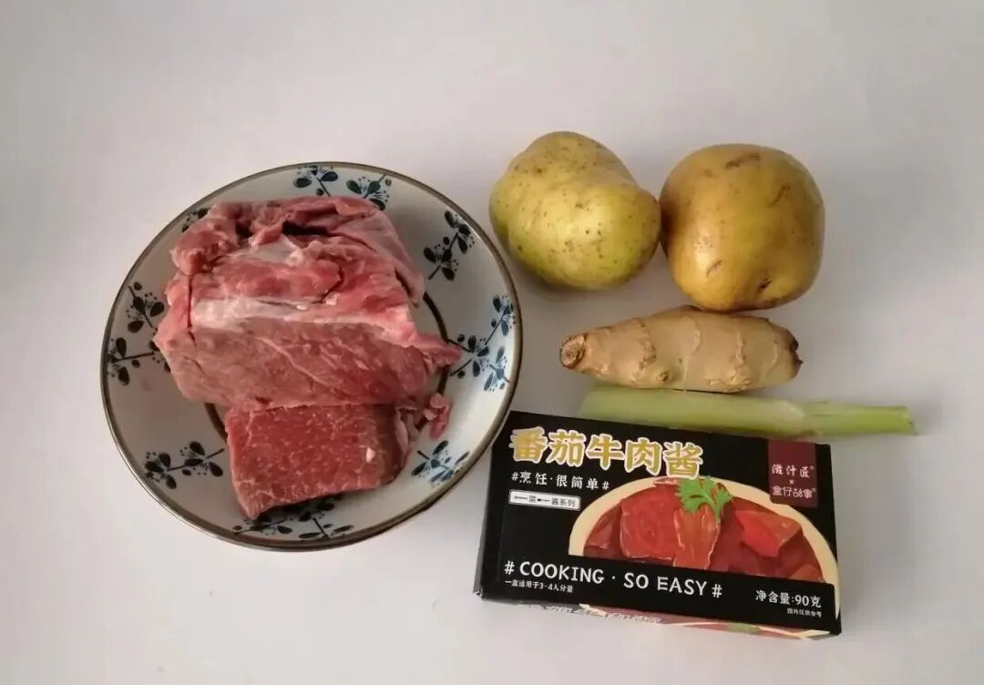 【牛肉炖土豆】 食材:牛肉500克、土豆2个、葱姜、油、盐、白糖、山楂干、番茄牛肉酱 做法及步骤: 第一步:牛肉、土豆、葱姜、酱料都准备好。 第二步:土豆去皮切成块备用。 第三步:牛肉切成小块,先过水焯一下,去除里边的血末,里边记得加点料酒去腥,牛肉可以多煮一会,大概煮上四五分钟捞出,用温水冲洗一下。 第四步:锅里放入油,放入一勺白糖,炒糖色,白糖融化变成这种焦糖色微微冒烟的时候就可以了,把肉倒进去快速的翻炒。 第五步:牛肉翻炒上色之后倒入葱姜。 第六步:炒出葱姜的香味,不需要加八角香叶,因为要放入这个番茄牛肉酱。 第七步:翻炒一下,牛肉被酱汁包裹住,颜色很漂亮,味道也很香。 第八步:加入适量的温水,不要加凉水,再放入几片山楂干,如果有新鲜的山楂最好,大火炖上半个小时。 半个小时之后,再倒入土豆块炖10分钟,土豆炖熟变软就可以关火了,因为放了山楂干,牛肉很好熟,所以不到一个小时就炖好了。