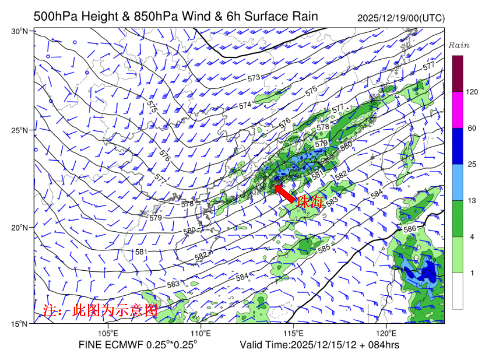 (12月19日08时500hPa高度场+850hPa风场+过去6小时降雨量预报图)不过别担心,此次降雨过程由暖湿气流引起的,气温日较差虽缩小了,但最低气温仍有所回升,和上周末冷空气带来的“阴冷”天气不一样。展望20日白天天色将逐渐好转,部分时间可见阳光。