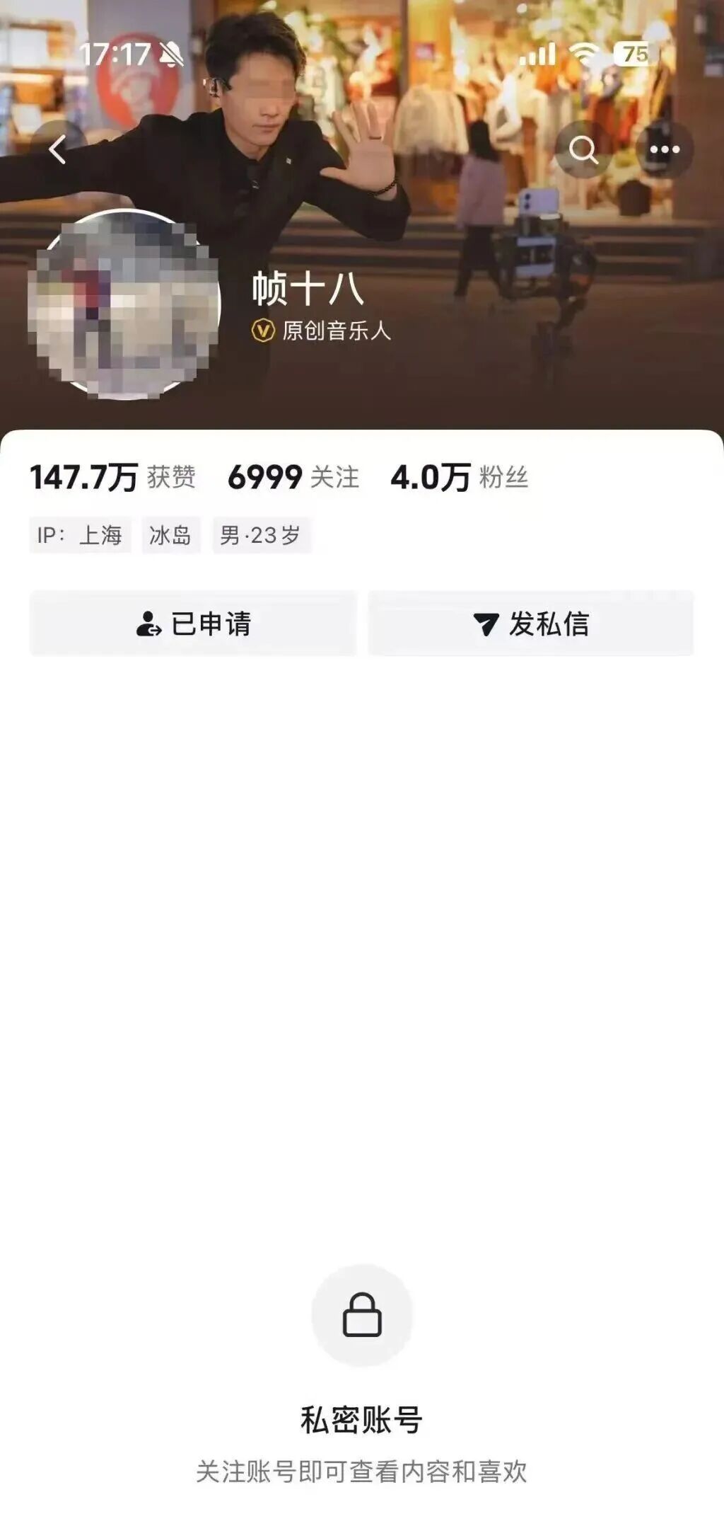 记者搜索发现,12月16日,在抖音平台上,“帧十八”账号有4万粉丝,目前,该账号已设置为私密账号,点击“关注”后,需要对方通过请求后才能成功关注。