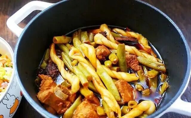 做法:做这道菜要先炖排骨。排骨冲洗干净,放入锅中,加入适量的水,盐,老抽,生抽,八角,桂皮,肉蔻,草果,小火慢炖。排骨用筷子能插入,快熟的时候放入豆角。和好的面团分成小剂子,搓成细长条,卷成卷子铺到菜的表面,炖熟出锅。