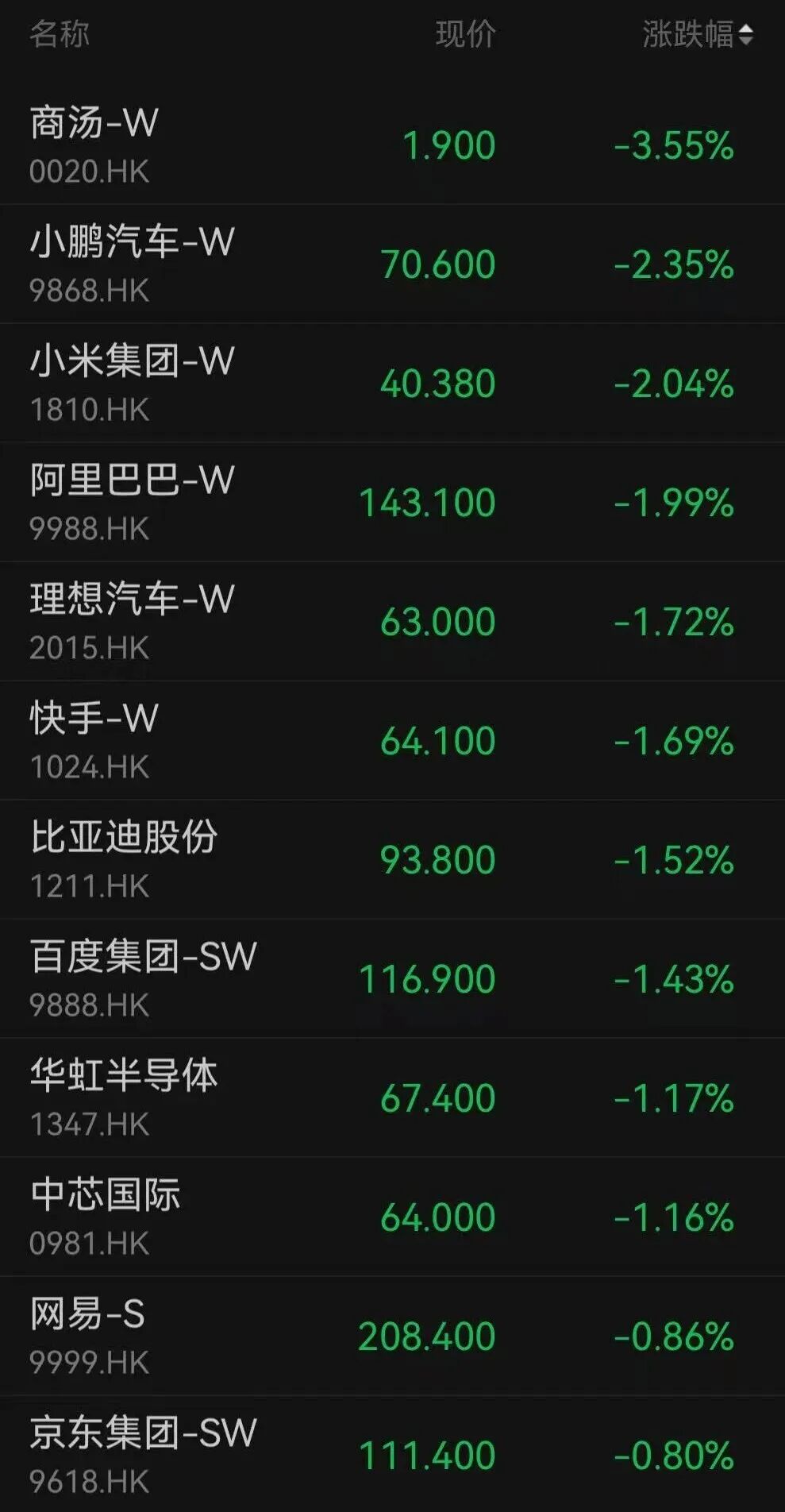 科网股多数回调,商汤跌逾3%,小米集团、小鹏汽车跌逾2%,阿里巴巴跌近2%,快手、百度集团、中芯国际、网易、京东集团集体走低。