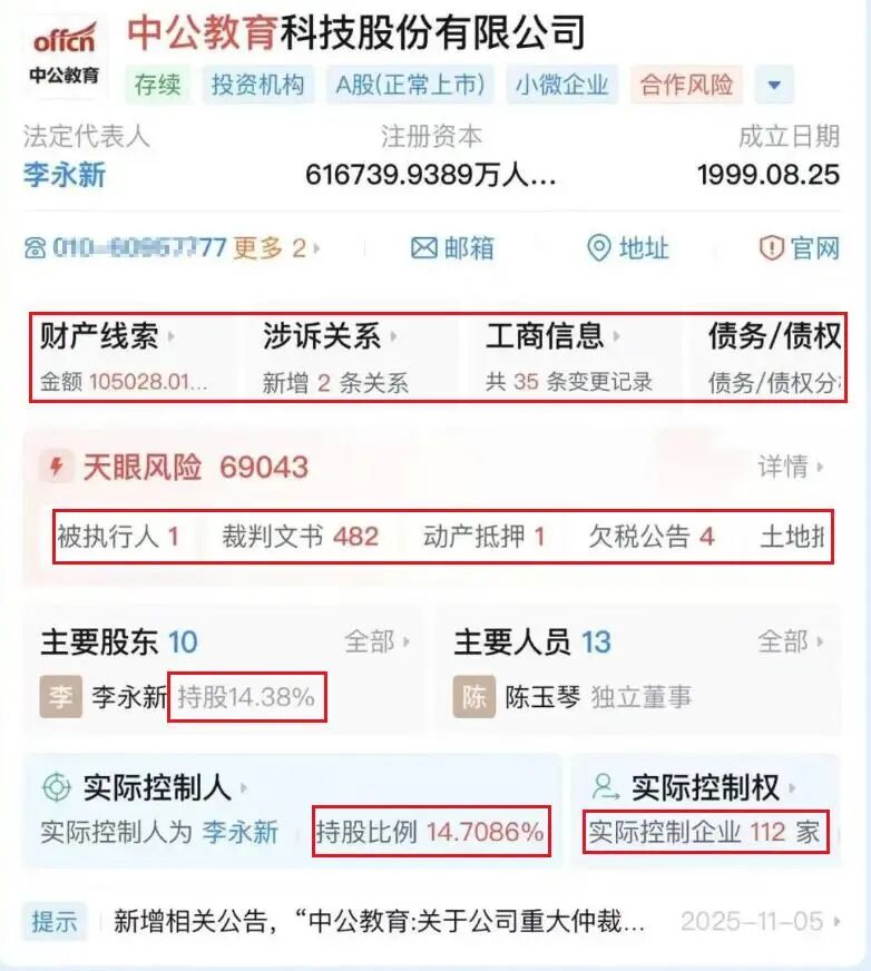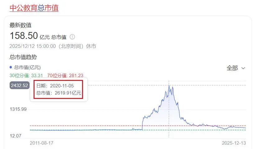 原本中公教育是起源于千禧年代初期,由北大学霸李永新创立,在2019年借壳上市,市值曾一度飙至2619.91亿元,李老板及其家族曾跻身胡润全球富豪榜,也是当年的“教育首富”。