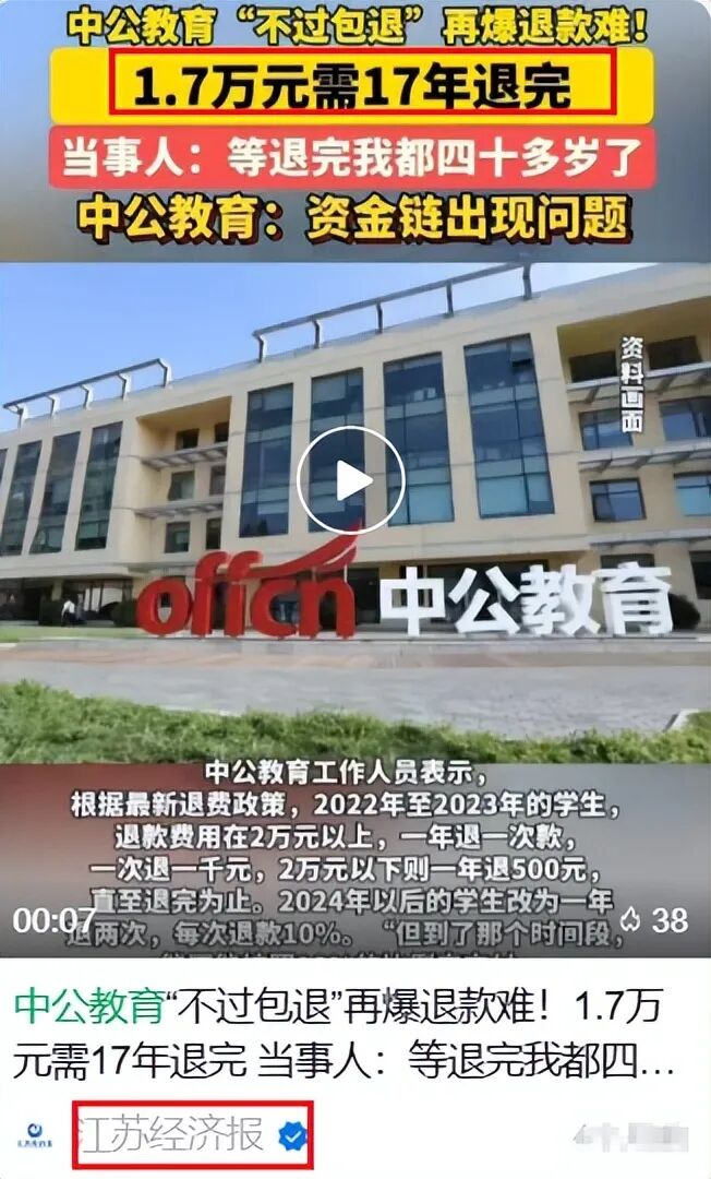 可万万没想到,学费交了一两万元,说好的考不过包退,如今这17000元的学费,官方给出回应是:要17年才能退完。