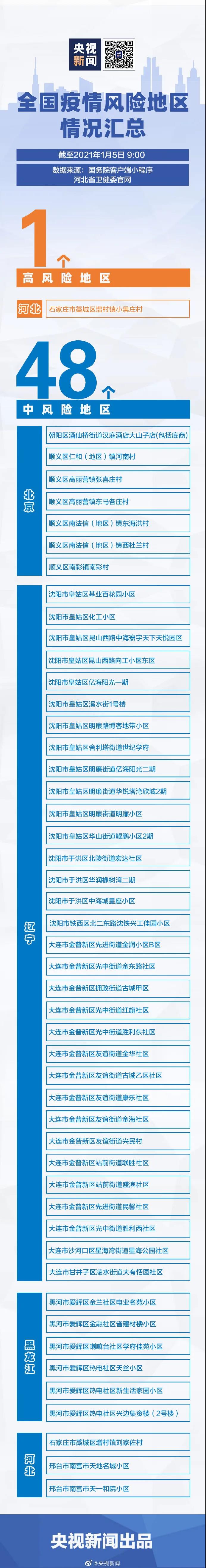 | 据河北卫健委今日(5日)通报:2021年1月4日0—24时,河北省新增14例本地新型冠状病毒肺炎确诊病例,其中石家庄市报告11例(2例为无症状感染者转为确诊病例),邢台市报告3例(1例为无症状感染者转为确诊病例)。无新增死亡病例,无新增疑似病例。1月4日0—24时,河北省新增30例本地无症状感染者,均为石家庄市报告。截至1月4日24时,河北省现有确诊病例19例(重型2例、普通型15例、轻型2例),累计治愈出院病例367例(含境外输入34例),累计死亡病例6例,累计报告本地确诊病例358例、境外输入病例34例。尚在医学观察无症状感染者40例。根据国务院应对新冠肺炎联防联控机制关于科学划分、精准防控等工作要求,自2021年1月5日起,将石家庄市藁[gǎo]城区增村镇小果庄村调整为高风险地区。目前,石家庄市藁城区增村镇刘家佐村、邢台市南宫市天地名城小区、邢台市南宫市天一合院小区为中风险地区。全省其他地区均为低风险地区。 据央视新闻,石家庄市藁城区增村镇小果庄村为全国唯一高风险地区。