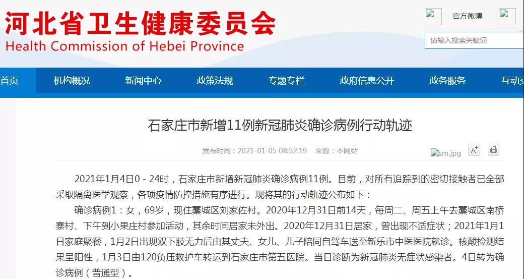 2021年1月4日0-24时,石家庄市新增新冠肺炎确诊病例11例。 目前,对所有追踪到的密切接触者已全部采取隔离医学观察,各项疫情防控措施有序进行。现将其的行动轨迹公布如下:确诊病例1:女,69岁,现住藁城区刘家佐村。2020年12月31日前14天,每周二、周五上午去藁城区南桥寨村、下午到小果庄村参加活动,其余时间居家未外出。2020年12月31日居家,曾出现不适症状;2021年1月1日家庭聚餐,1月2日出现双下肢无力后由其丈夫、女儿、儿子陪同自驾车送至新乐市中医医院就诊。核酸检测结果呈阳性,1月3日由120负压救护车转运到石家庄市第五医院。当日诊断为新冠肺炎无症状感染者。4日转为确诊病例(普通型)。确诊病例2:男,65岁,现住藁城区小果庄村。2020年12月31日前14天,患者和妻子每周三、五到本村参加活动。2021年1月1日患者与妻子均出现咳嗽、头痛等症状,持续至1月3日,期间居家未外出。1月3日,全村核酸检测,结果呈阳性,当日由120负压救护车转运至石家庄市第五医院。1月4日诊断为确诊病例(普通型)。确诊病例3:女,30岁,现住藁城区刘家佐村。2020年12月17日至21日一直居家未外出。12月22日去本村集市买菜和日常用品,12月23至24日居家未外出。25日回本村父母家与其父母妹妹接触,其余时间一直与丈夫、儿子在自家门店居住,未外出。1月3日全村核酸检测中结果呈阳性,当日由负压救护车转运至石家庄市第五医院。1月4日,诊断为确诊病例(普通型)。确诊病例4:女,89岁,现住藁城区小果庄村,2020年12月17日至2020年12月27日期间,分别于12月20日和27日下午2点至4点与二儿子(确诊病例2)及二儿媳到本村参加活动,其他时间一直居家无外出。12月28日至2021年1月1日期间一直居家未外出。1月2日患者因乏力、轻微咳嗽由二儿子骑电动车送增村镇中心卫生院就诊,当日收入院治疗。1月3日核酸检测阳性,当日由120负压转运车转运至石家庄市第五医院,1月4日诊断为确诊病例(普通型)。确诊病例5:女,66岁,现住藁城区小果庄村。2020年12月17日至2021年1月3日,患者一直未出本村。2020年12月20日和27日曾前往本村参加活动。12月30日至2021年1月1日在本村某诊所输液3天。1月2日下午核酸检测结果呈阳性,1月3日晚复检结果仍呈阳性,1月4日上午,由负压救护车到石家庄市第五医院,当日诊断为确诊病例(普通型)。确诊病例6:女,55岁,现住藁城区小果庄村。2020年12月20日至26日患者居家未外出。12月27日患者步行前往本村参加活动,停留约1小时,结束后步行返回家中。12月28日上午骑电动车到机场北路附近某酒店参加婚礼,下午未外出。12月29日至31日患者居家未外出。2021年1月1日晚饭后因头痛和咳嗽,骑电动车前往本村村医处拿药。1月2日进行核酸采样并居家隔离。1月3日核酸检测结果呈阳性,当日由负压救护车转运至石家庄市第五医院。1月4日诊断为确诊病例(普通型)。确诊病例7:女,58岁,现住藁城区小果庄村。患者长期在距离本村约1公里某缝纫厂上班,每日骑电动车上下班。2020年12月18日至19日在家陪同由京回来的儿子儿媳,居家未外出。12月20日至31日一直居家未外出。2021年1月1日在家陪同由石家庄回来的女儿。1月2日与家人一同乘私家车前往附近村表妹家参加婚礼,返回家中后外出,当晚23时进行核酸检测筛查。1月3日核酸检测检测呈阳性,当日经120负压救护车转运至石家庄市第五医院。1月4日,诊断为确诊病例(普通型)。确诊病例8:女,53岁,现住藁城区小果庄村,分别于2020年12月21日、24日和27日晚4点-6点至南双井、北双井、东庄、马头铺等地卖烤鸭。12月23日去燕客隆超市购物,12月30日和2021年1月1日两次去本村参加活动,其余时间居家未外出。2021年1月2日出现头晕、头痛,未就诊,1月3日核酸检测结果呈阳性,当日由负压救护车转运至石家庄市第五医院。1月4日诊断为确诊病例(普通型)。确诊病例9:女,55岁,现住藁城区刘家佐村。2020年12月11日至24日,一直居家未外出。25日早上6点与儿媳妇、孙女乘坐本村出租车到河北省儿童医院呼吸科就诊,中午12点转诊到新乐市医院后返回家中。12月26日早上其爱人自驾车带其到小果庄村医务室就诊,输液四天。12月26日至31日居家未外出。2021年1月1日晚大女婿自驾车带其到藁城区广泰花园小区大女儿家,1月2日大女儿及女婿自驾车带其到藁城北大街诊所就诊,1月3日到藁城区人民医院就诊,当日核酸检测结果呈阳性,于23时由负压救护车转运至石家庄市第五医院。1月4日诊断为确诊病例(重型)。确诊病例10:男,66岁,现住藁城区小果庄村,2020年12月23日出现咽痛症状,期间未吃药,未就诊。12月24日至27日居家未外出;12月28日到机场北路某饭店参加婚礼。12月29日至2021年1月1日居家未外出。1月2日晚因感不适自行服药。1月3日全村核酸检测,结果呈阳性,当日由120负压救护车转运至石家庄市第五医院,诊断为无症状感染者,1月4日转为确诊病例(普通型)。确诊病例11:女,34岁,现住藁城区小果庄村。在小果庄村饲料厂从事机械生产饲料工作。2020年12月10-24日,患者每天从家步行至单位上下班。2020年12月25日至2021年1月3日,辞职回家照顾生病的母亲。偶尔去附近的便利店买菜。12月28日,出现咽痛,未就诊、未服药,期间至2021年1月2日居家未外出。1月3日在本村核酸检测筛查,结果呈阳性。当日由负压救护车送往石家庄市第五院隔离治疗,诊断为确诊病例(轻型)。在此提醒广大市民,如果在相同时间、地点有
