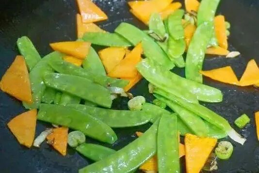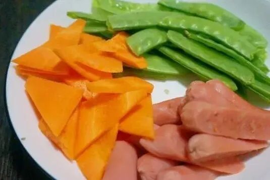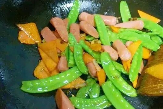 今天的这盘菜是用火锅剩下的脆皮肠制作而成。菜中还加入了荷兰豆和胡萝卜一起爆炒,不但让营养加分了,而且促进食欲。