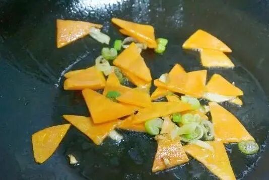 2.锅中放适量的食用油,油热后放葱花煸香。先倒入胡萝卜片煸炒,炒至半熟。