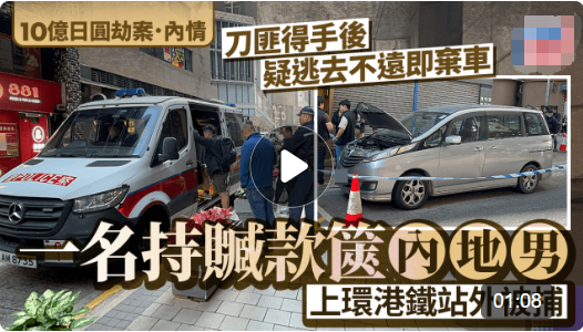 其中2人手持開山刀聲稱打劫,3名匪徒強搶走4個篋後,登上一部接應七人私家車逃離現場。 受害人立即報警求助,警員馳至在附近兜截兇徒,未幾在上環港鐡站D出口外,拘捕一個手持大量日圓篋的內地男子,帶署扣查。 警方稍後在蘇杭街138號路旁發現一輛可疑私家車,該車身有輕微損毀痕跡。不排除劫匪駕車至上址時,3刀匪與接應司機棄車而逃。 被捕的43歲姓叢男子,持雙程證來港,警方正追查其來目的,以及追緝其同餘在逃劫匪。案件由港島總區重案組1B隊跟進。 現場消息稱,案中39歲受害人是永樂街一間找換店的職員,而該批被搶10億日圓是屬於另一擁有人的,事主經營外貿生意,賺取日圓並兌換成其他貨幣賺取差價,其生意已經營多年,以往沒有發生過搶劫事件。 事發前找換店職員與其51歲司機,分4個篋盛載10億日圓現金,在新紀元廣場對開下車,打算到附近銀行將日圓兌換成港元。 豈料當他們落車時即遇劫。