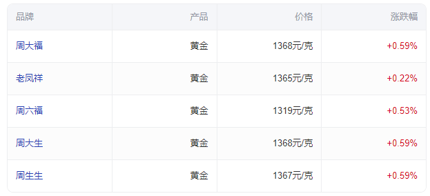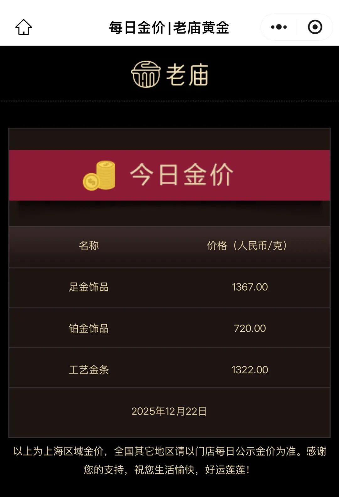 12月22日,周大福足金(饰品、工艺品类)报1368元/克,较20日上涨8元/克;老庙黄金足金饰品报1367/克,较20日上涨6元/克。12月19日,知名黄金品牌周大福再次提价。此前,周大福已在今年3月和10月底进行了两次调价,加上本次,年内累计已涨价三次。从实际涨价情况来看,部分畅销款一口价黄金产品的实际涨幅超过30%。如27克左右的爆款五帝钱盘缠手串,价格从38600元上调至50800元,从标价来看上涨幅度为31.6%。而根据周大福柜姐晒出的新价签,12月19日上调之后的新价格为53800元。一位网友说,今年1月买的算上折扣总共花了两万多,“没想到一年不到升值了2倍多。” 周大福并非唯一宣布涨价的品牌。老铺黄金在2025年内涨价三次,周生生也于10月16日起正式调价,“一口价”黄金饰品涨幅在25%—35%之间。此外,周大生“一口价”金饰预计在月底进行涨幅15%左右的调价。 今日金价显示:部分品牌金克价为1368元/克,上涨0.59%。 来源: 广州日报、如有侵权请联系删除