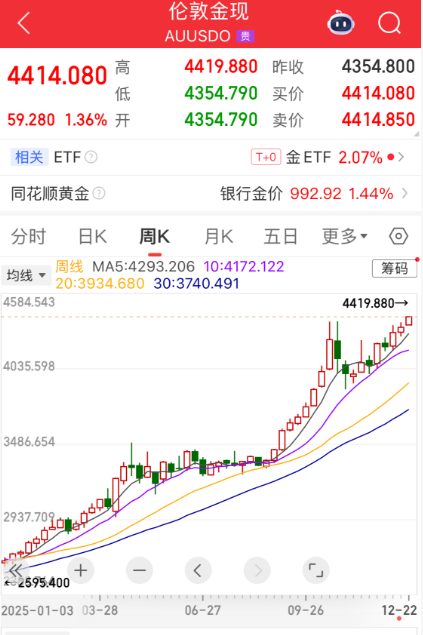12月22日 现货黄金站上4400美元/盎司 现货黄金涨约1.7%