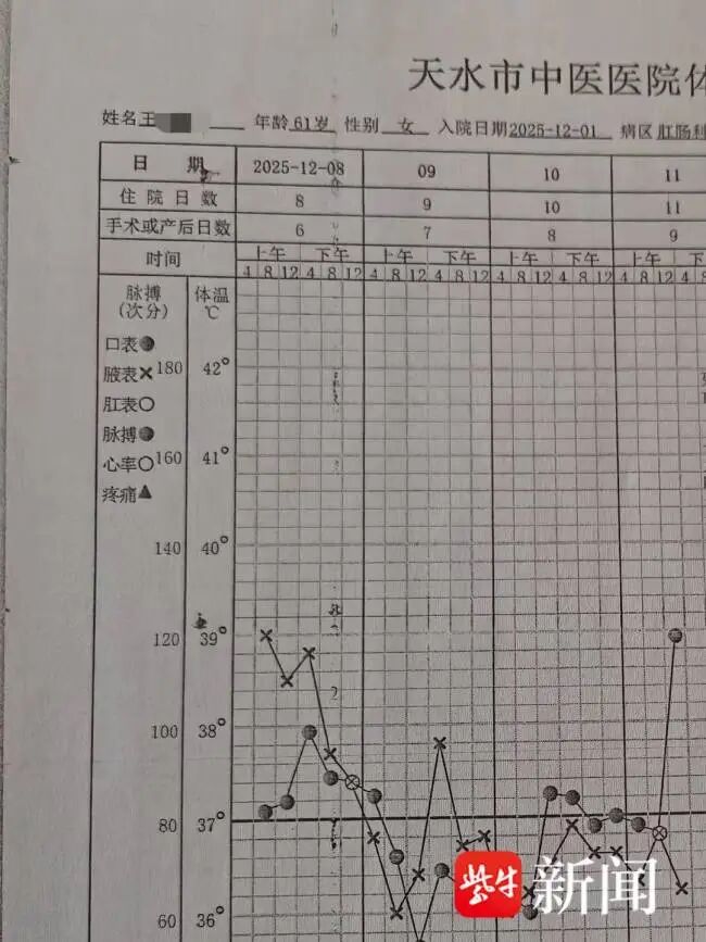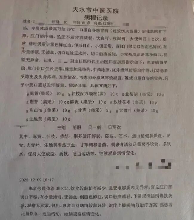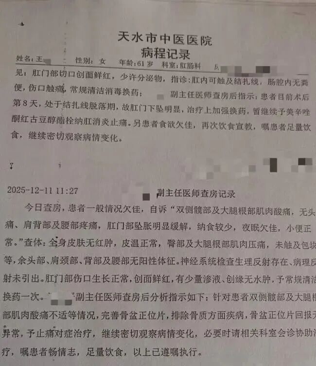 据石先生介绍,他的母亲王女士于12月1日在天水市中医医院肛肠科就诊,并于次日接受了痔疮手术。术后,母亲一直住院观察。石先生提到,选择这家医院是因为之前母亲在这里做过同样的手术,且离家较近。