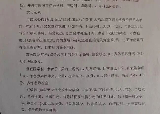 多学科讨论记录中显示,12月11日下午,患者突发口齿不清,下肢疼痛、无力、气短、口唇发绀,立即通知值班医生进行抢救,但最终无效,宣布临床死亡。