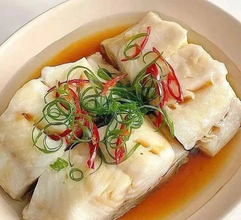 做法也超简单,超市买回来是冻的,提前解冻好,洗干净表面水分,盘子里铺姜片和葱段打底,鳕鱼放上去再铺一层姜片。蒸锅烧开水后,大火蒸8分钟,关火后再焖2分钟,这一步别省,鱼肉更嫩。