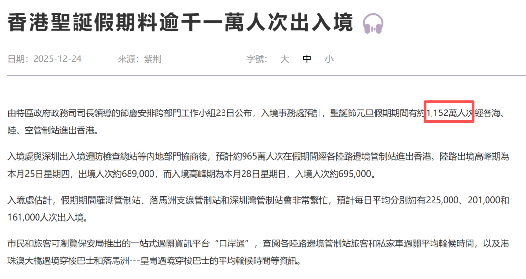 (图源:运输署) 来自广州的王先生,就计划带着家人游览香港故宫文化博物馆,顺便一路吃遍特色美食。也有车主,把这次行程,直接定为“吃、玩、买”三件套,有人预算费一两万元,购买服装、电子产品等,还预订了一月份再自驾来港三次。更有家庭选择在香港住上一晚,入住荃湾一带的酒店,专门预约餐厅、打卡特色美食,出行就自驾。除了粤车南下车主南下带来了消费,恰逢香港节日气氛正浓,同样吸引了不少人。入境事务处表示,预计接下来2个假期会有1152万人次经各管制站进出香港,其中罗湖、落马洲、深圳湾管制站还是最繁忙的!人一多,酒店是最先感受到的。让人意外的是,早在10月,就已经有人预订了这个月底的房间。目前,香港部分酒店的订房率高达九成,几乎接近满房。文体旅局昨日在社交平台发帖时表示,访港旅客增加,反映无论是探亲访友还是节日旅游,香港都是旅客首选目的地之一。对于餐饮业和酒店业来说,这波客流无疑是喜闻乐见的。最后祝大家在香港玩得开心,好好感受浓厚的节日氛围!