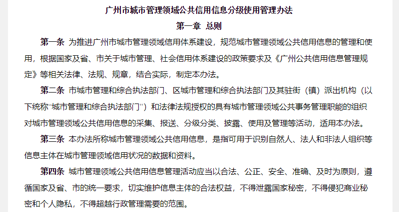 根据广州市城市管理综合执法局通报,为规范城市管理领域公共信用信息的管理和使用,《广州市城市管理领域公共信用信息分级使用管理办法》(以下简称《办法》)已于日前发布,并将于3月1日正式施行,有效期为3年。《办法》结合城市管理工作特点,探索按失信行为性质严重程度对失信信息进行等级划分,为广州市城管领域失信主体的分类管理提供条件。 解读1:信用计分制是什么? 据介绍,《办法》实行信用计分制,每个信息主体原始信用分为100分,在城市管理领域无失信记录且未被纳入国家联合惩戒对象名单的信息主体即为城市管理领域诚信主体。《办法》建立了加减分机制,如信息主体被区级以上城市管理和综合执法部门予以行政奖励、一年内参加城市管理领域志愿者活动每累计达10个小时等情况,可获得加分;而产生不同等级的失信行为,则会扣除相应分数。扣分后的失信主体按信用状况被划分为轻微失信主体、一般失信主体、严重失信主体三个等级。被纳入国家联合惩戒对象的信息主体,同步纳入城市管理领域严重失信主体。 解读2:哪些行为会被扣信用分? 失信信息按程度划分为严重失信信息、一般失信信息、轻微失信信息三个等级。
