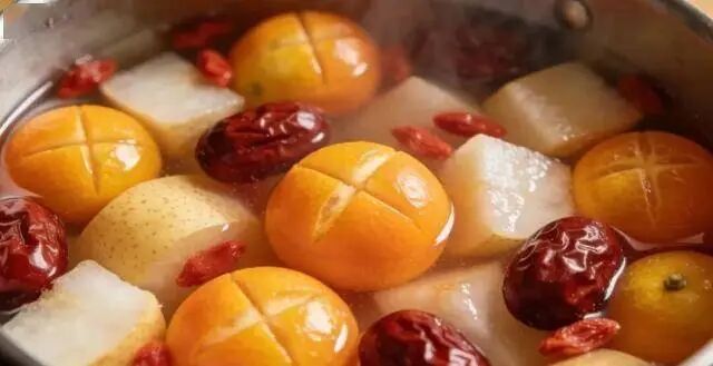 做法不复杂:先把金桔洗净切十字口,雪梨带皮切块,红枣去核;所有食材放入锅中,加适量清水,大火煮开后转小火炖 20 分钟;最后放入枸杞焖 5 分钟,晾温就能喝,果肉也能一起吃掉,口感丰富。
