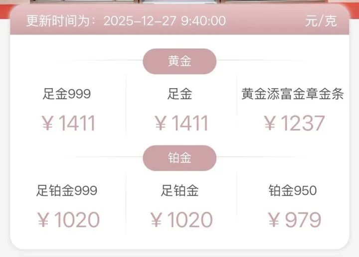 12月27日,周大福、周大生、老凤祥足金饰品价格均达1413元/克,周生生足金饰品价格为1407元/克,金至尊足金饰品价格达1411元/克。