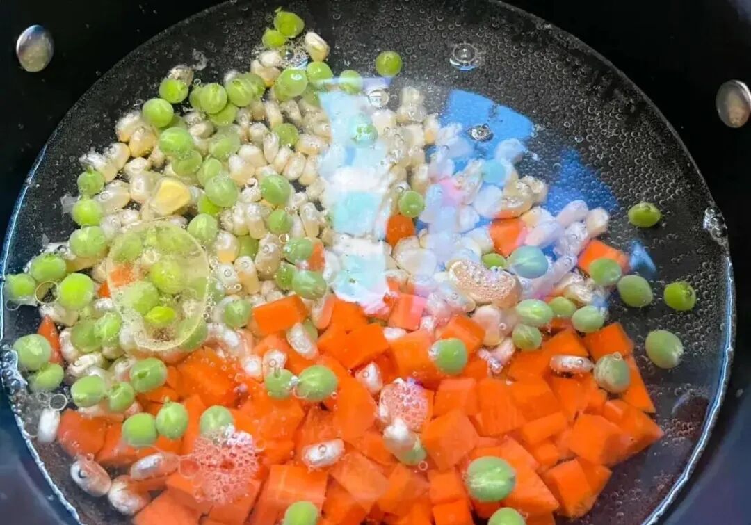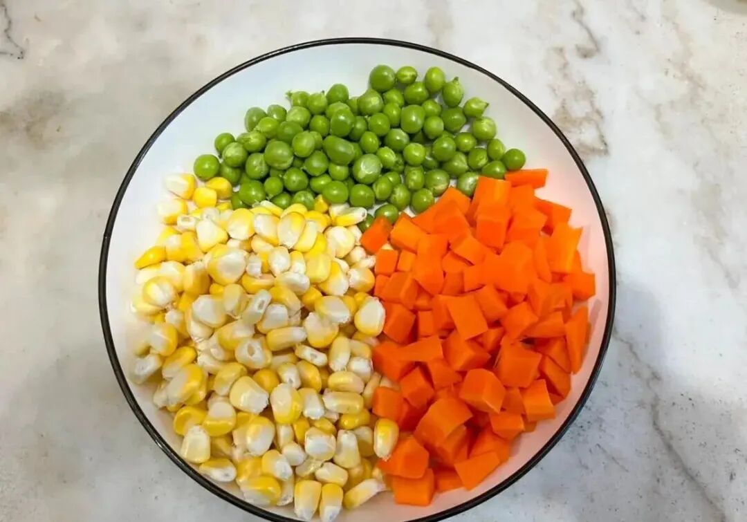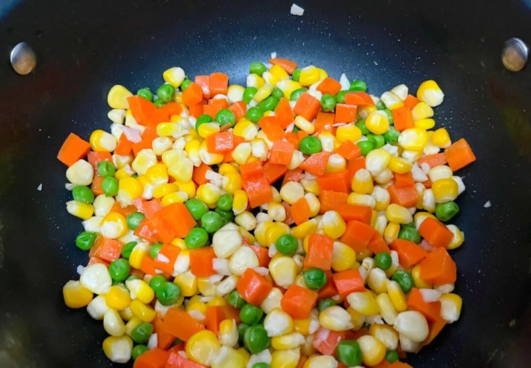 倒入玉米粒、胡萝卜丁、豌豆翻炒均匀