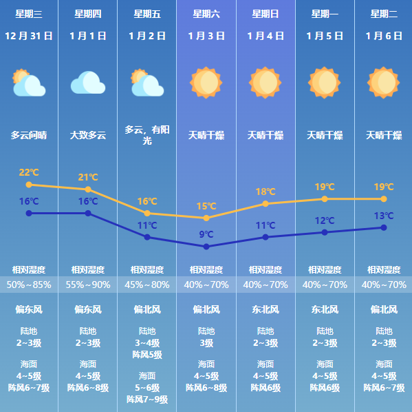 预计我市31日至1月1日(元旦)以多云天气为主,日间温暖舒适;1月2日-3日受强冷空气影响,气温显著下降,北风清劲,体感寒冷。元旦假期天气显著转冷,海面风力较大,请注意防风保暖;天气干燥,需注意防火和用火用电安全。