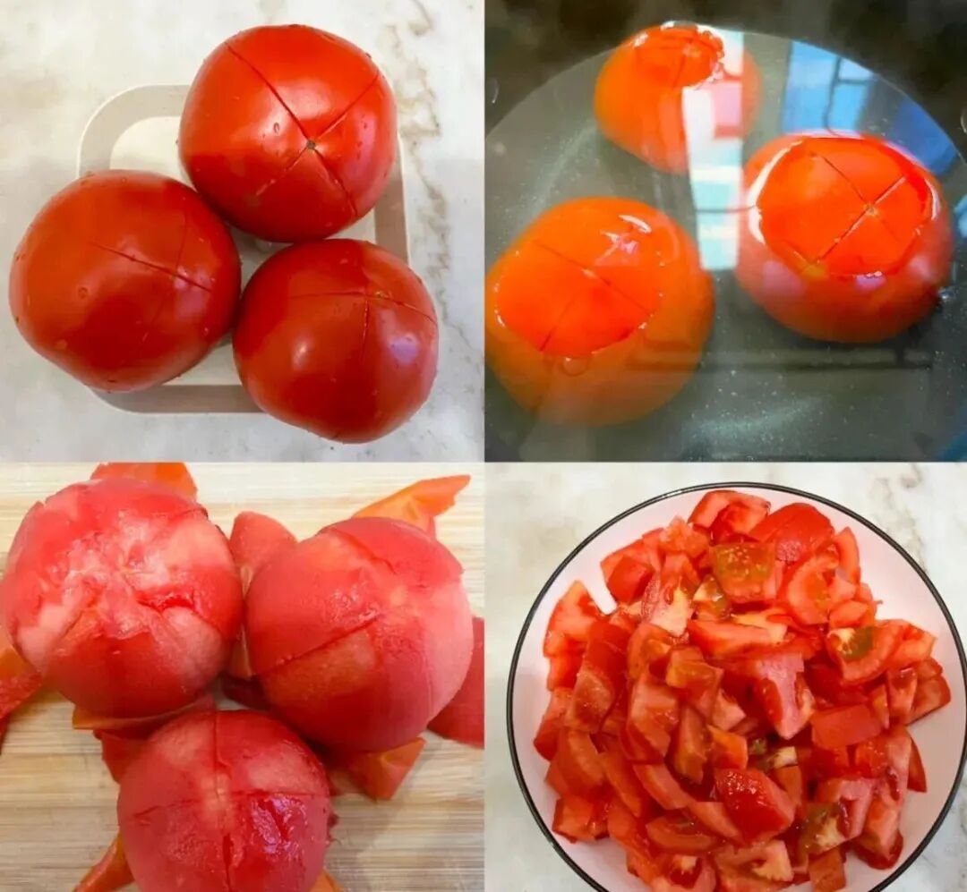 放入开水中浸泡3分钟剥掉外皮、去蒂
