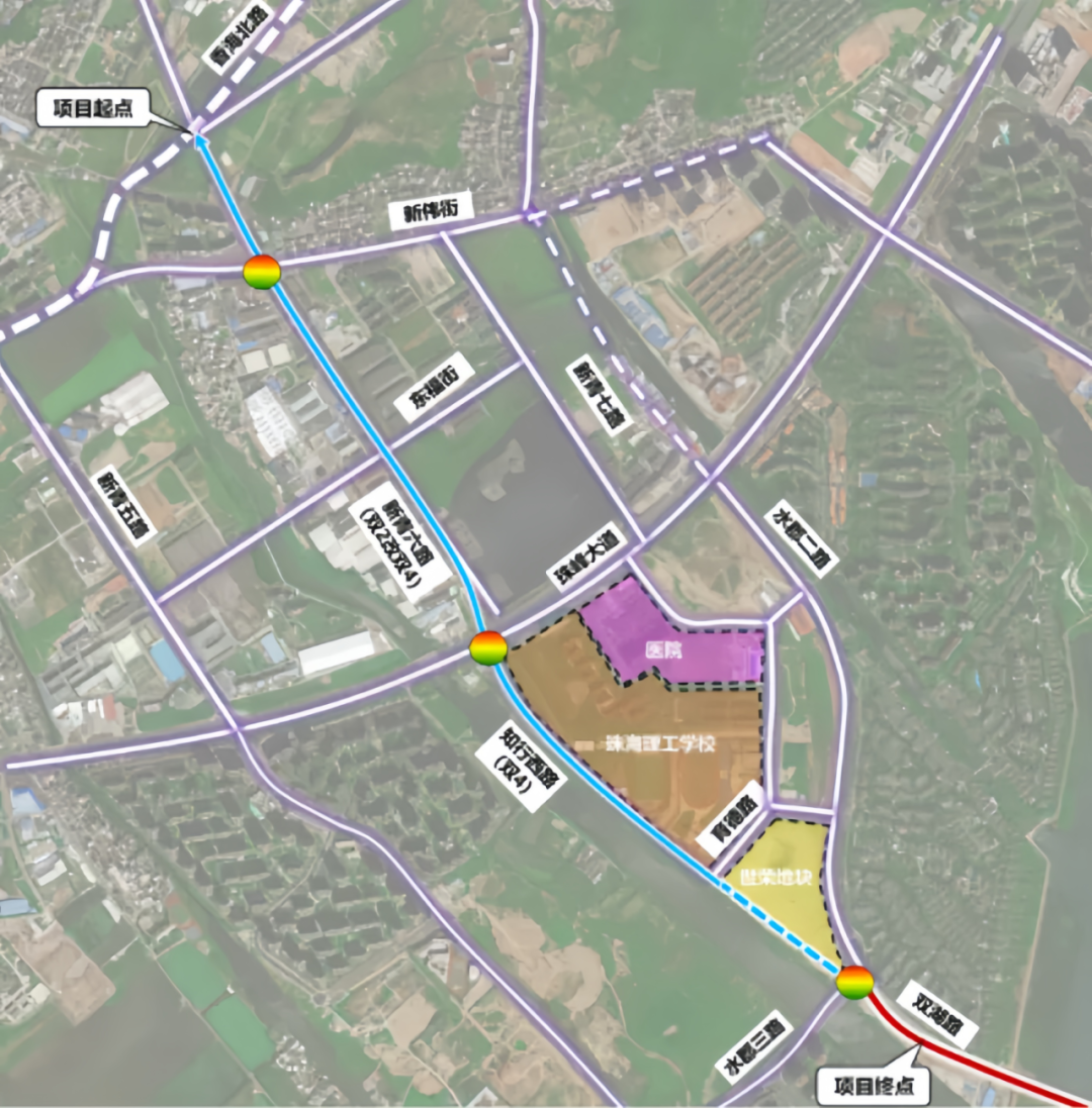 工程主线全长约3.04千米,其中,新青六路改造为双向四车道,知行西路现状利用约740米,新建知行西路南延(含双湖路局部改造)约740米。