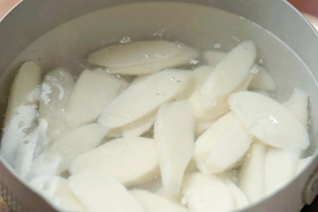 2、山药焯水:一锅水大火煮沸后放入山药片,煮1分钟后捞出沥干水分。焯水时间不能过长,否则会影响脆爽的口感。