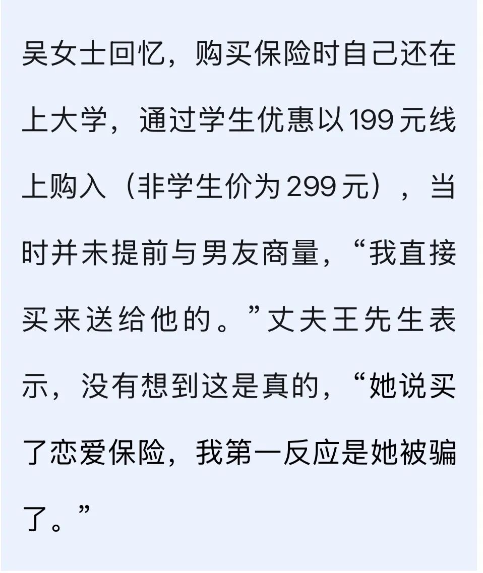 吴女士表示,这份中国人寿的“恋爱保险”保单上写明:
