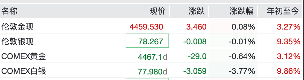 现货黄金、白银同步大幅回调,夜盘分别收跌0.87%、3.56%。截至北京时间7:00,现货黄金小幅上涨,报4459.53美元/盎司,现货白银在78美元/盎司附近震荡。