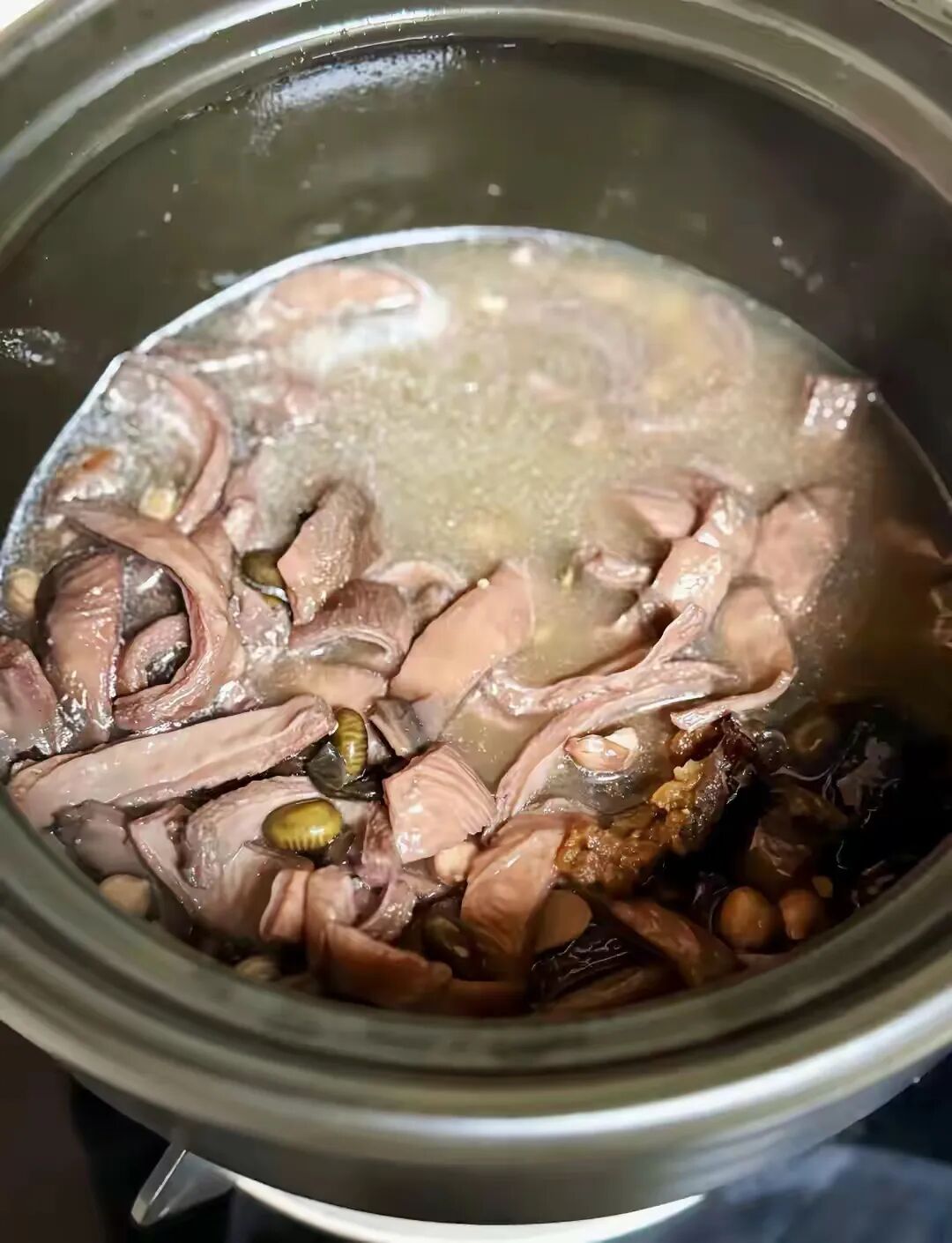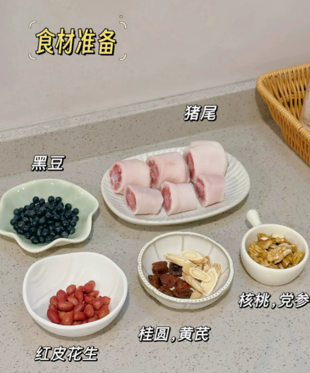 黑豆花生提前泡两小时以上,再把所有材料放进砂锅,加足量清水大火烧开撇去浮沫,转最小火盖盖慢炖一个半小时到两小时,直到黑豆开花猪小肚软烂,喝前加盐撒点白胡椒粉就行。用面粉和盐搓洗两遍,是猪小肚不腥的秘诀,加个蜜枣能让汤味更甘润。黑豆核桃猪尾汤侧重补,黑豆补肾核桃健脑,猪尾富含胶质能强健腰膝筋骨,适合腰腿乏力、记性变差,或者秋冬想给身体打基础的人。
